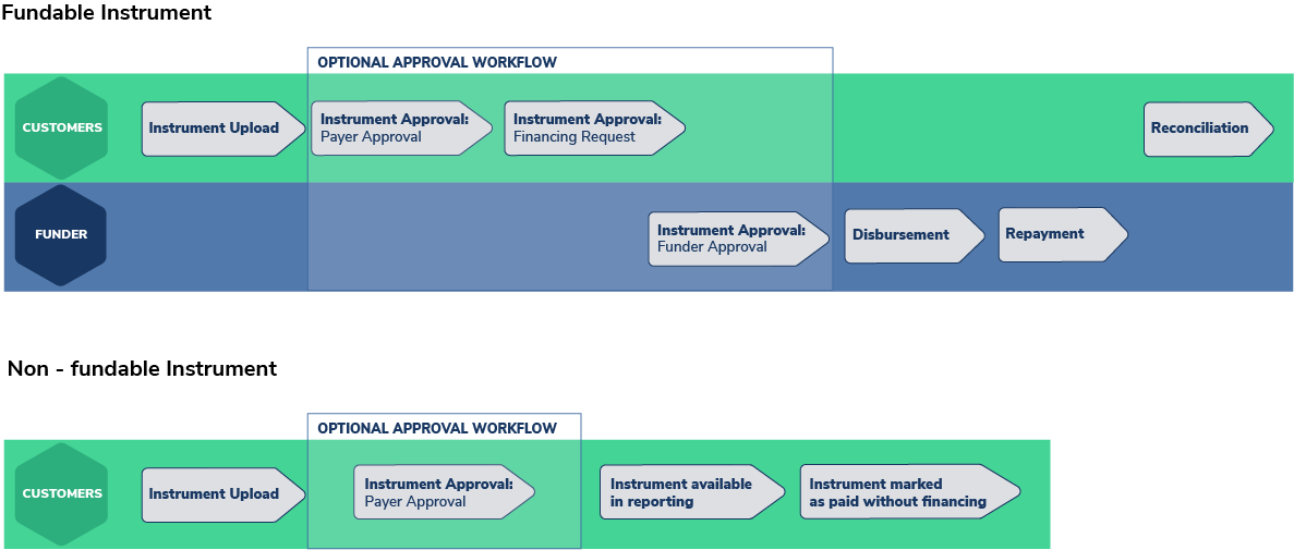For Fundable Instruments: Instrument Workflow is a sequential process of requests, reviews and approvals from first uploading an Instrument leading to it being funded and then repaid. There are multiple opportunities to customise which steps are required and who must complete them.